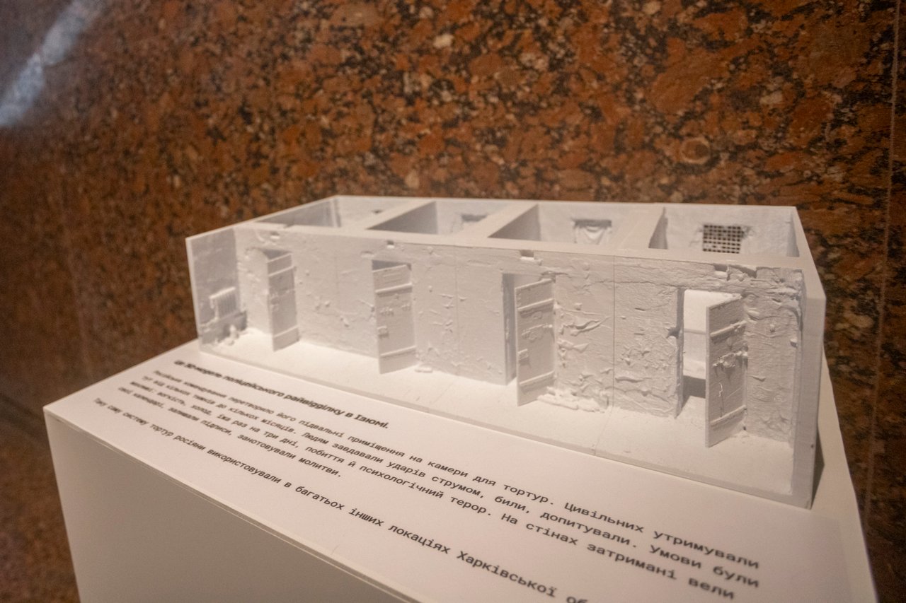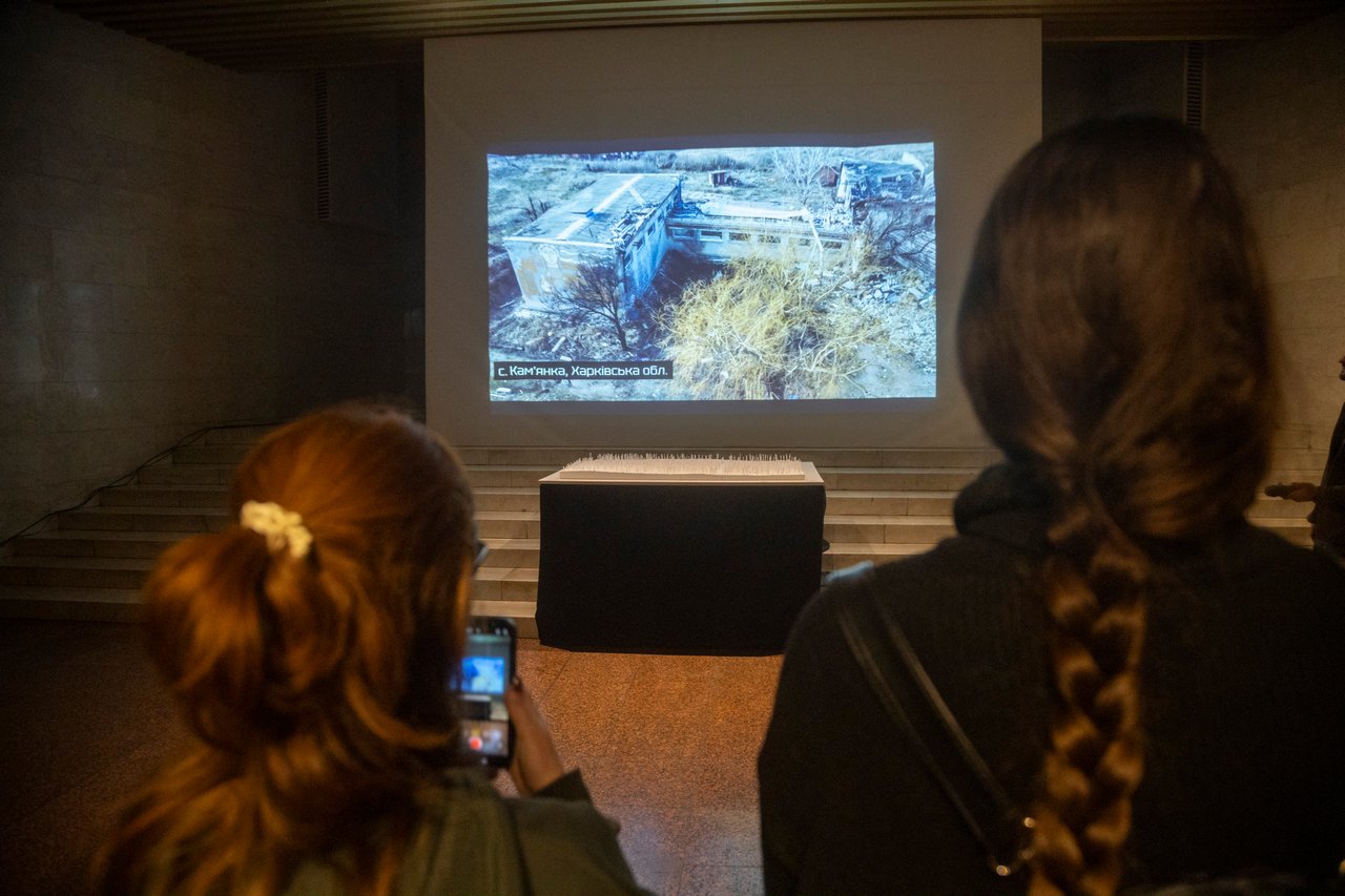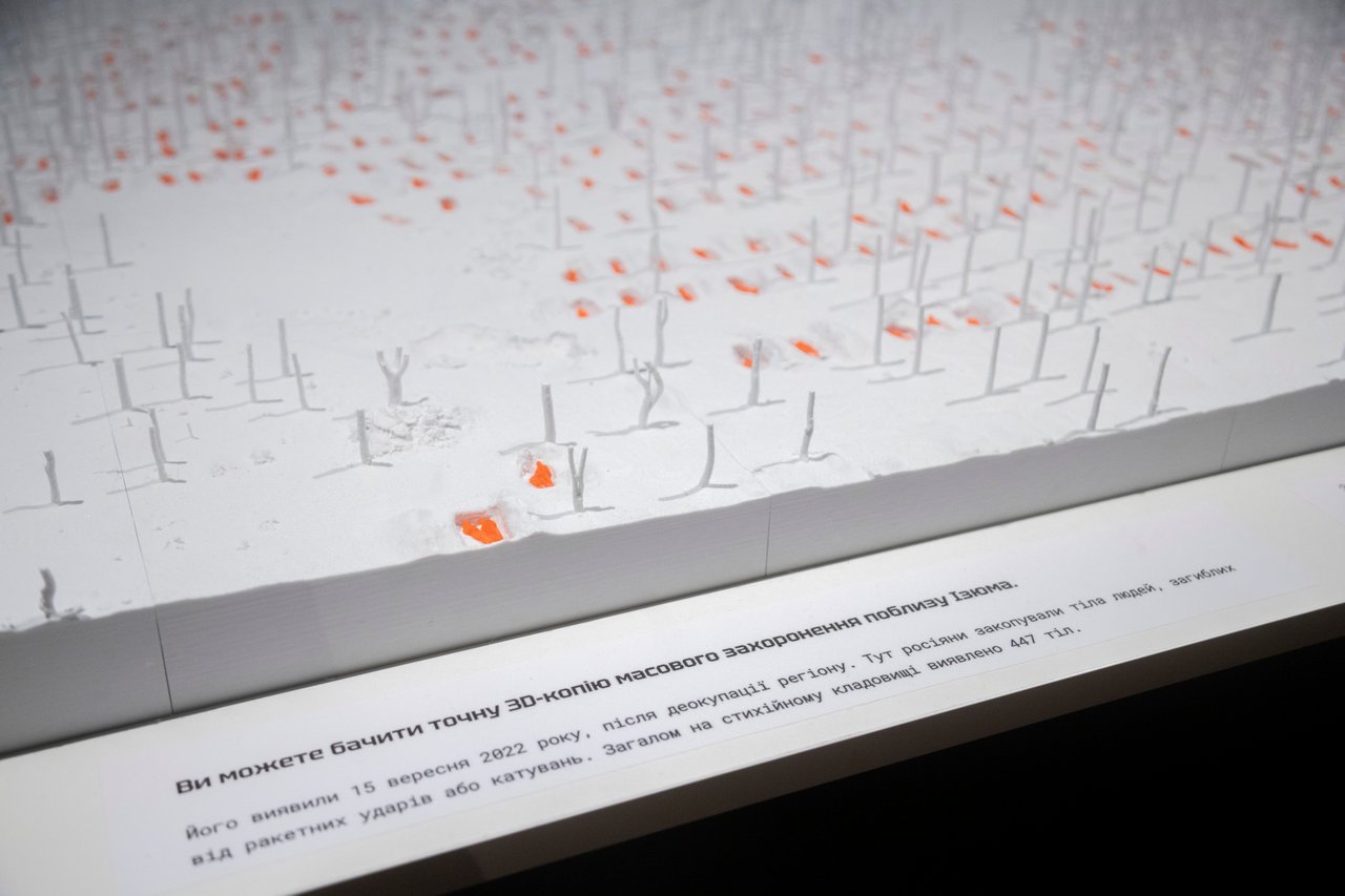 В основі експозиції — масив цифрових даних, зібраних під час експедицій на деокуповані території Харківщини. Йдеться про 3D-моделі зруйнованих об’єктів інфраструктури, місць незаконного утримання цивільних осіб, а також масових поховань у районі Ізюма.