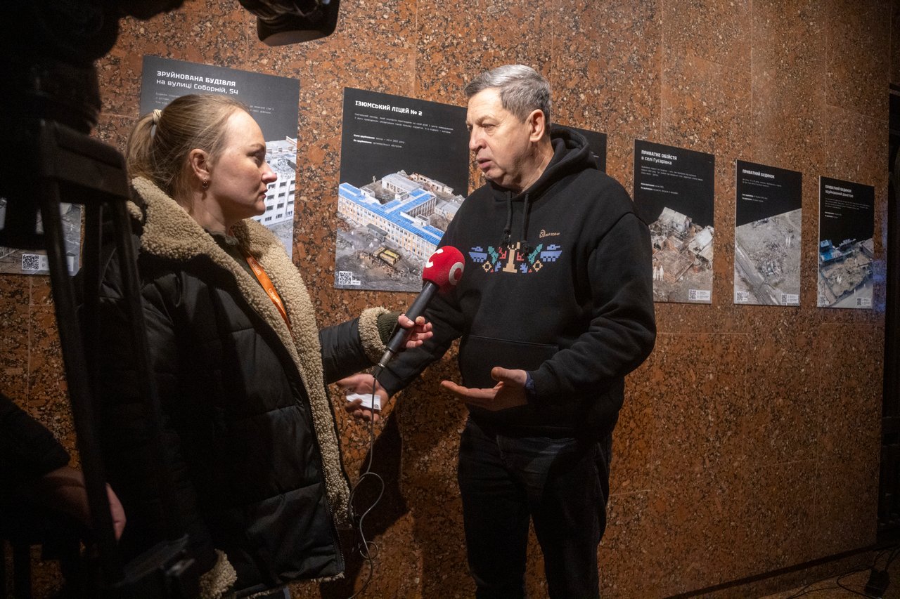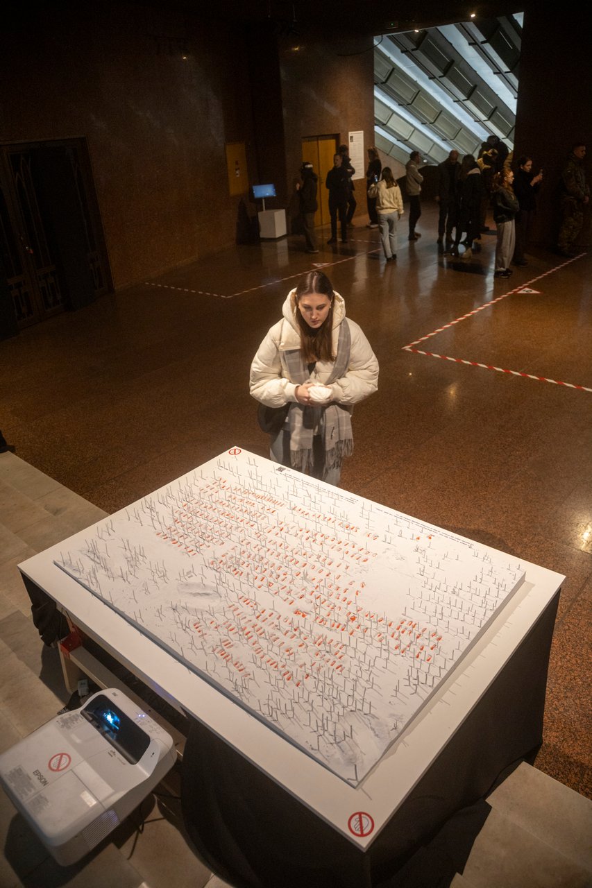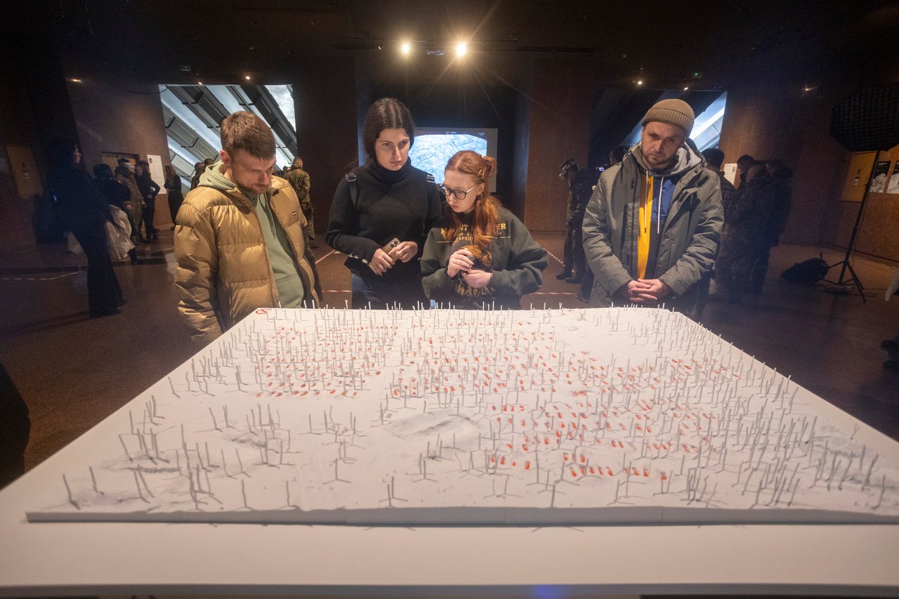 В основі експозиції — масив цифрових даних, зібраних під час експедицій на деокуповані території Харківщини. Йдеться про 3D-моделі зруйнованих об’єктів інфраструктури, місць незаконного утримання цивільних осіб, а також масових поховань у районі Ізюма.