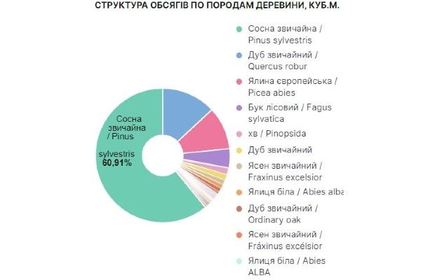 Найбільший попит на ринку мали пиломатеріали з порід дерев: сосна звичайна – 60,91% від загального продажу ресурсу, дуб звичайний – 13,08%, ялина європейська – 10,3% та бук лісовий – 4,58%.