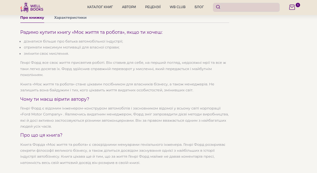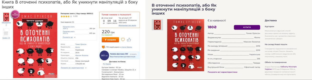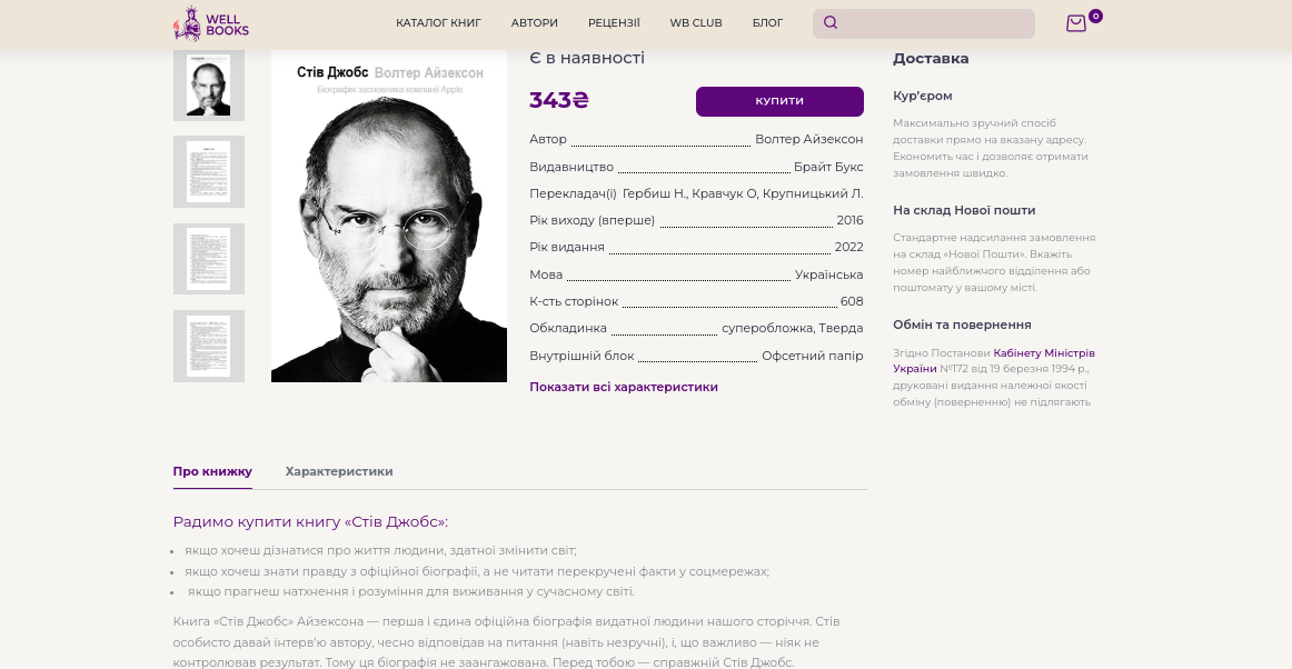 На товарній сторінці інформація подається у простій та стислій формі: можна ознайомитись із коротким описом книги, дізнатись скільки в ній сторінок та інші подробиці. Також одразу наводяться дані про доставку та оплату. Тобто кожен користувач одразу отримує всю необхідну інформацію в одному місці.