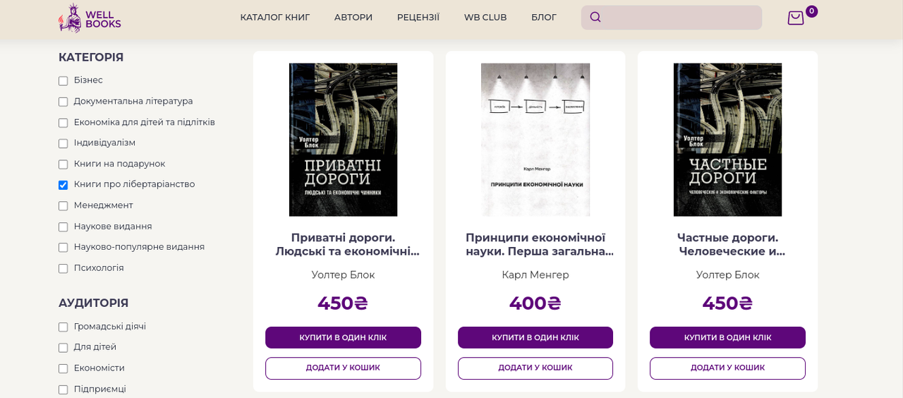 Але особливістю асортименту книгарні WELL BOOKS також є випуск унікальних творів для книжкового ринку України. Вони будуть цікавими тим, хто дотримуються лібертаріанських поглядів. Це унікальні переклади відомих економістів та науковців, які до цього ніколи не видавали в нашій країні. Тобто покупці цього сайту мають ексклюзивну можливість придбати цікаві книги з економіки, аналогів яких в Україні немає.