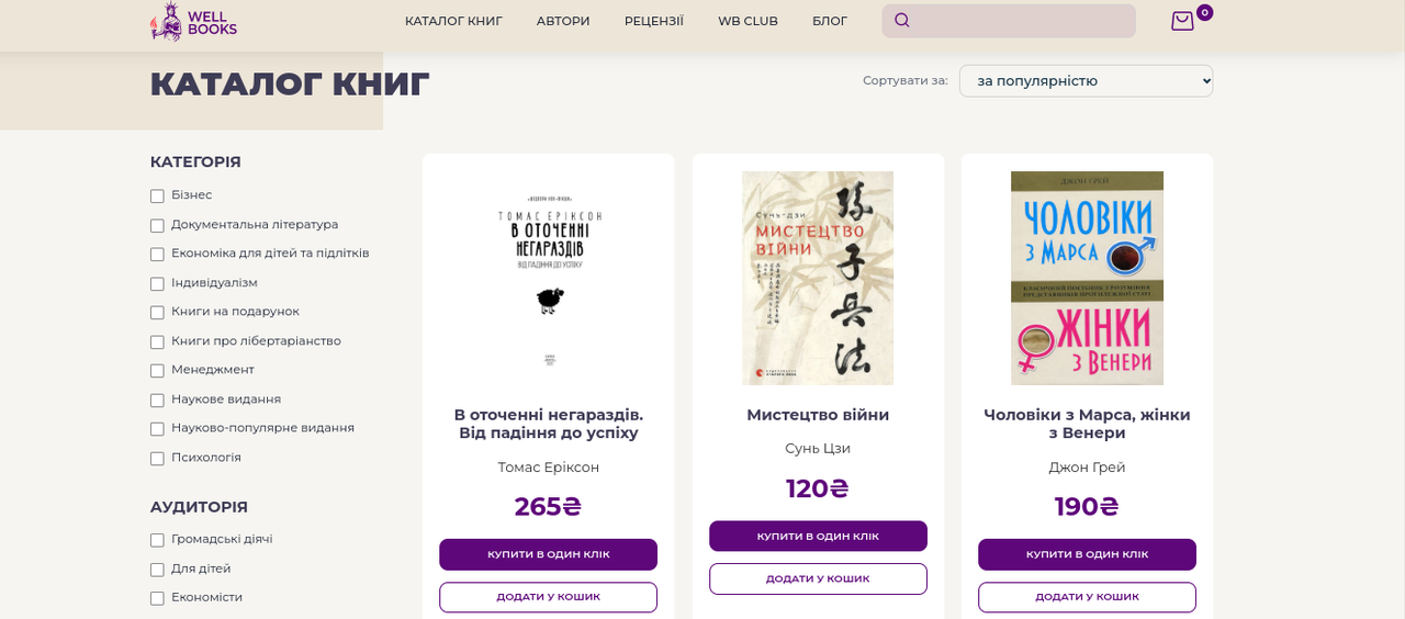 Асортимент сайту WELL BOOKS досить різноманітний. Але в цілому можна зробити висновок, що він буде цікавий як мінімум трьом групам цільових клієнтів: