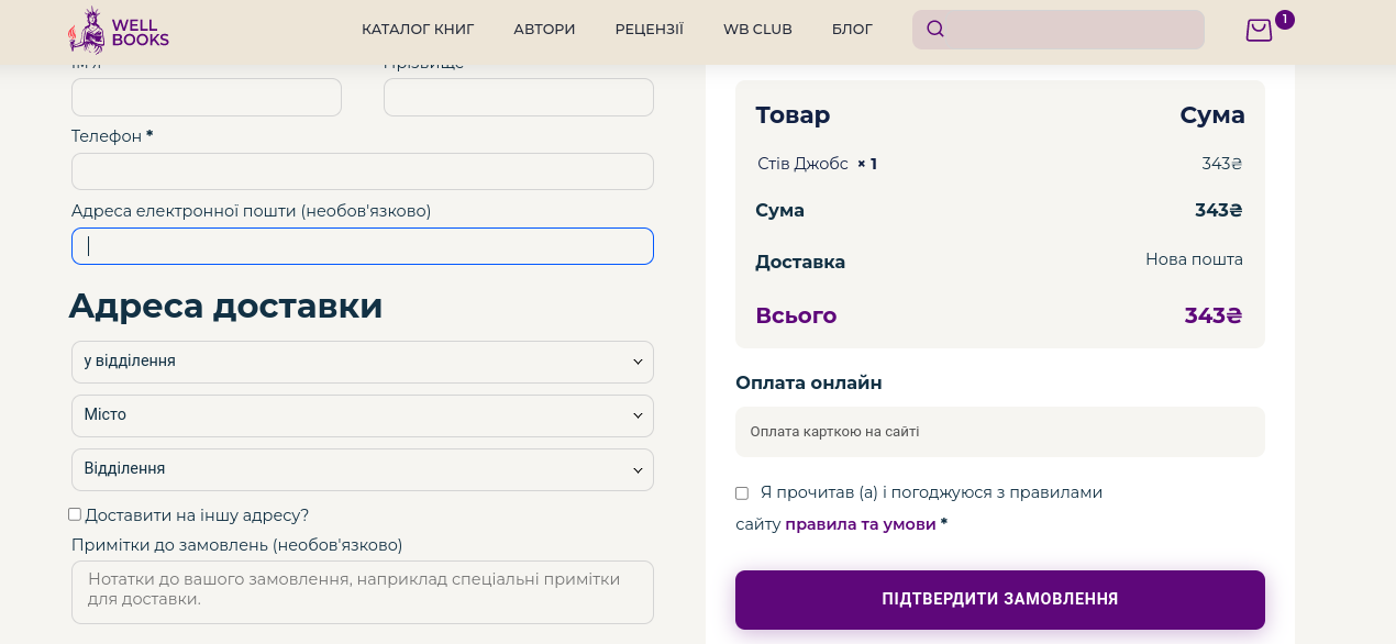 При оформленні замовлення необхідно ввести мінімум даних: обов’язково варто вказати ПІБ, номер телефону, інформацію для доставки, а також свій власний e-mail. Все максимально просто та зрозуміло.
