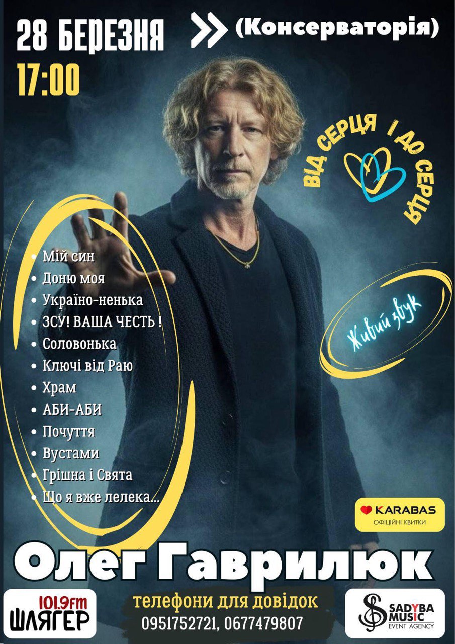 28 березня у Національній музичній академії України відбудеться концерт Олега Гаврилюка — відомого виконавця та автора, чия творчість поєднує поезію, музику та глибокий філософський зміст.